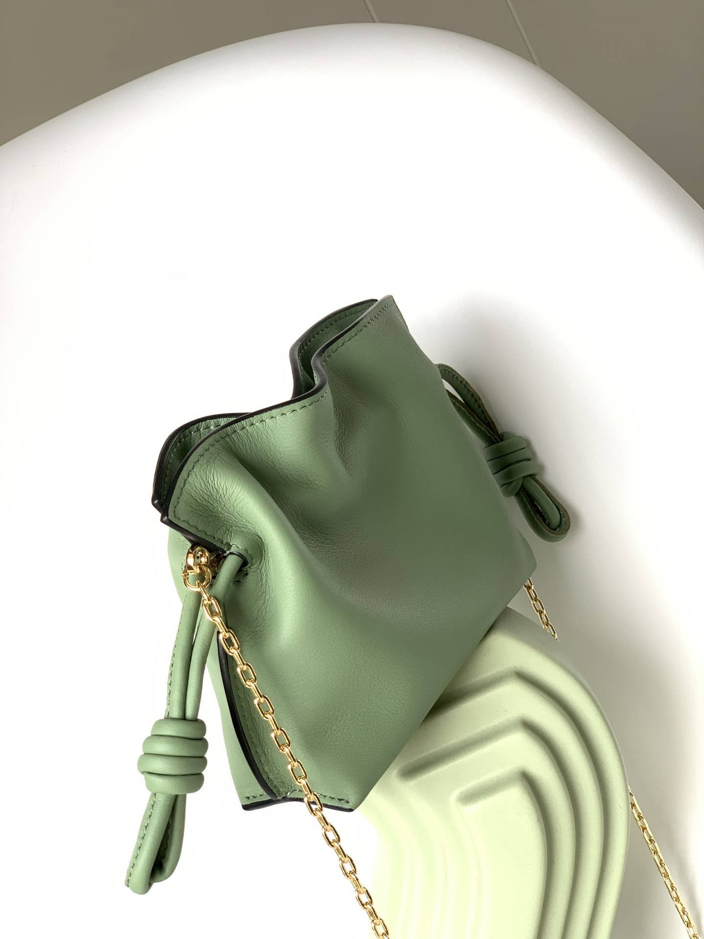 Loe*weFlamenco mini升级版福袋到货采用拉绳收紧 并打上标志性的盘绕结 选用优质柔软小牛皮 “肩背 斜挎或手拿*可拆卸和可调节链条肩带*朴素的磁扣开合 金色绒面革衬Anagram 压纹 型号:10853 Size:15.5*12.5*5.5cm :()