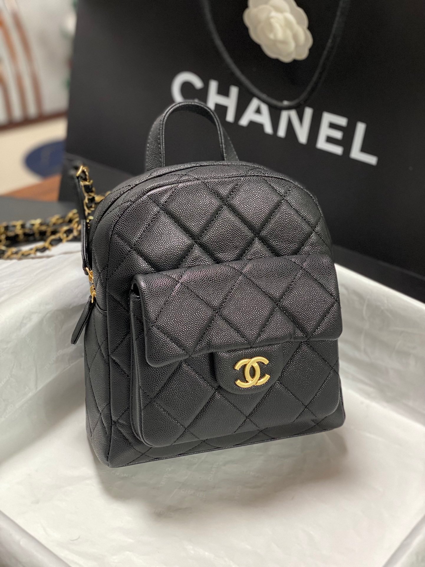 Chanel.: The shoulder bag, with a capacity of 25K small backpack, features both the small backpack and the classic popular styles. Made from textured leather that is durable and beloved by perfume fans, adjustable straps make it cute and practical.