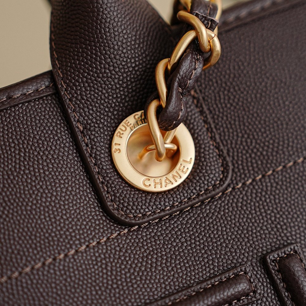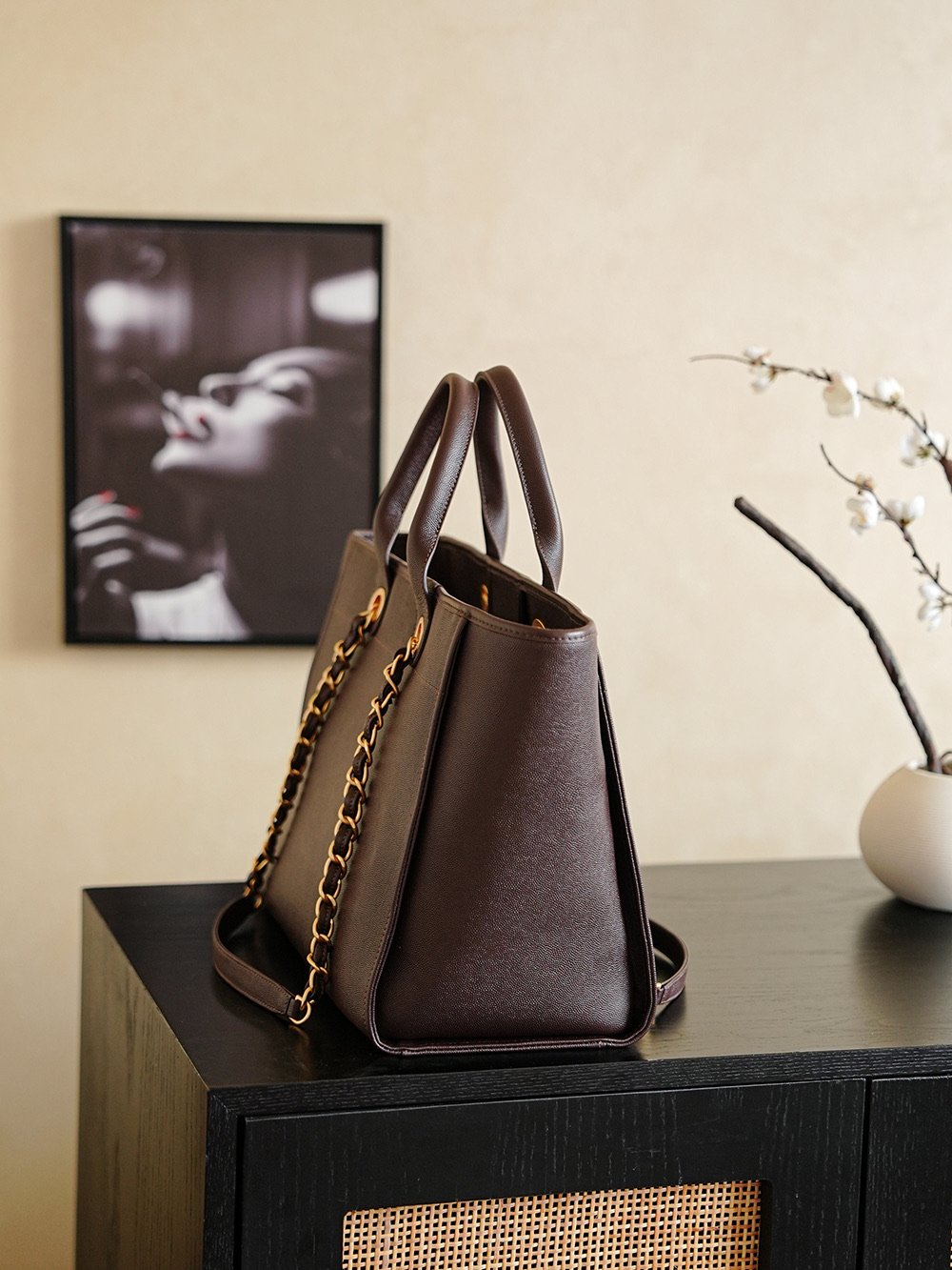 “Coffee Brown Texture” 25K Shopping Bag Beach Bag Packaging Elements, Very Feelful~ It’s Eye-catching and Attractive, The Overall Look Also Has A Campus Style. It’s A Colored Shopping Bag That You Can Carry Outdoors Regularly. Pure Classic Mini Chanel Style Bag. It Can Hold Notebooks Or Be Used As A Mom’s Bag. It’s Great For Daily Commuting And Work. The Capacity Is Really Satisfactory. The Quality Is Superb, Made Of Cowhide Material, With Leather Handles And Gold-plated Hardware, Very Cool. The Cold Atmosphere Comes Out Instantly When Worn. It Feels Like There’s A Buffering Effect From Its Own Charm. Go Ahead And Try It!!”