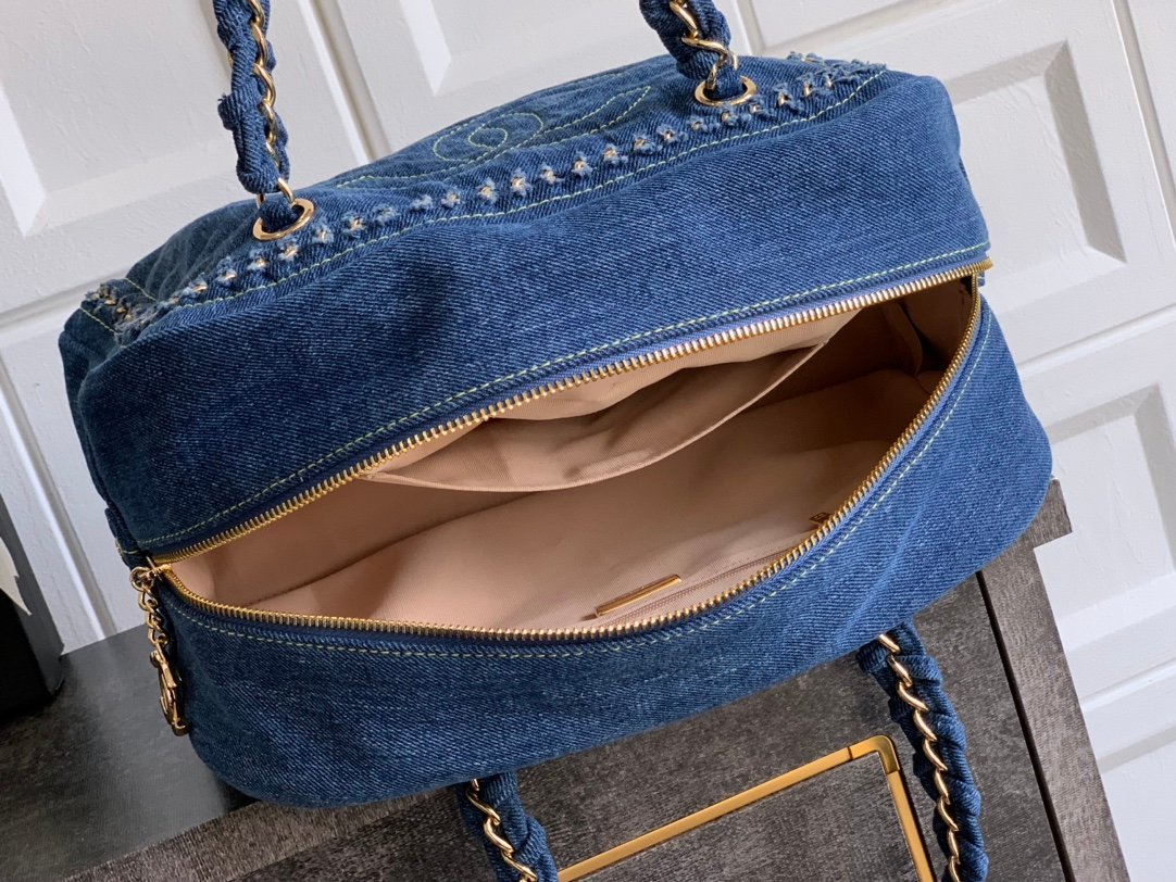 Conclusion: This bowling bag is perfect for a trendy girl’s style, suitable for both casual daily outfits and semi-formal occasions. It can add a touch of retro elegance to your fall outfit when paired with trench coats and short boots; in spring and summer, it can bring a lively feel when styled with dresses. The denim tote measures 33×20.5X15 cm.