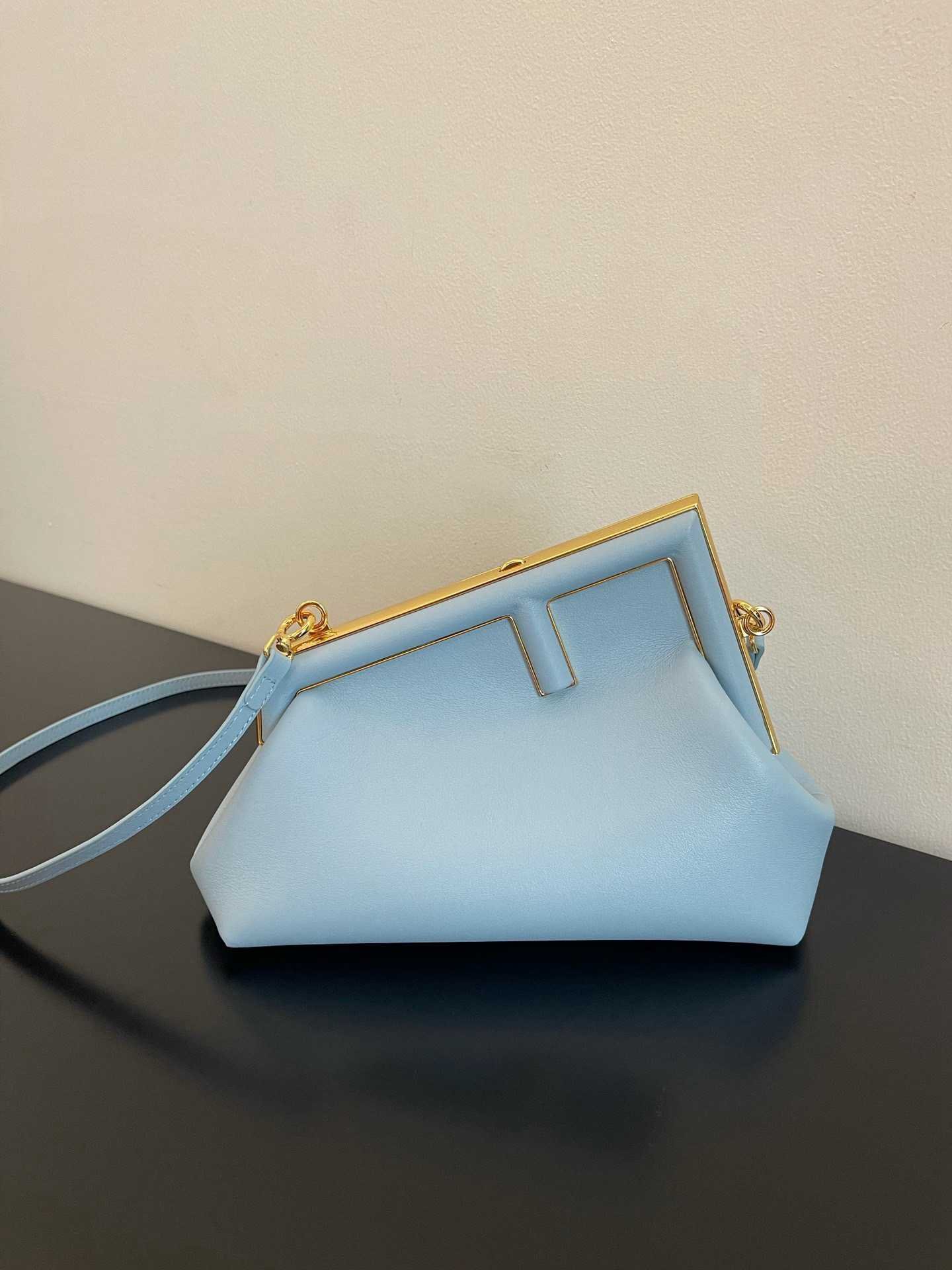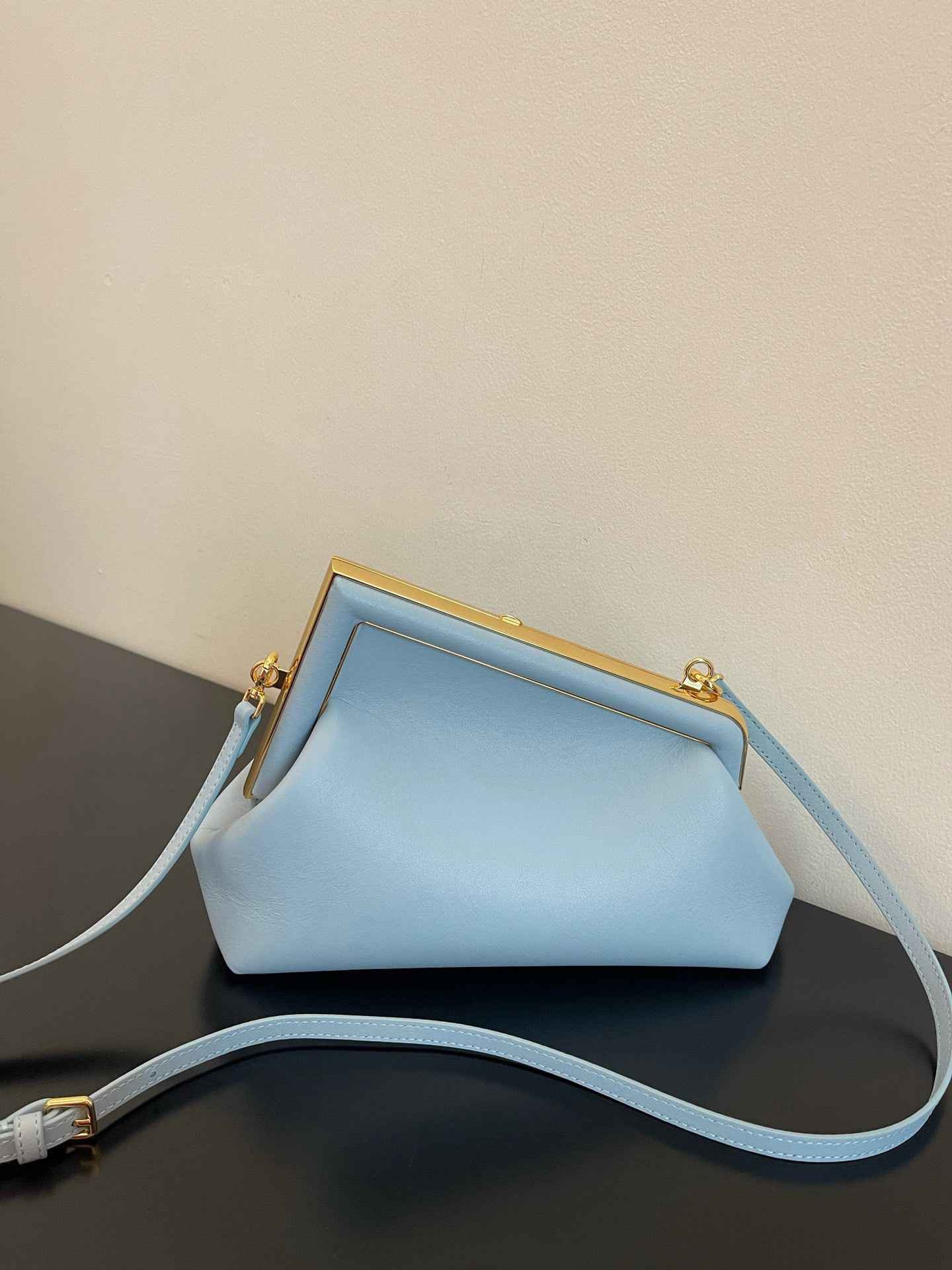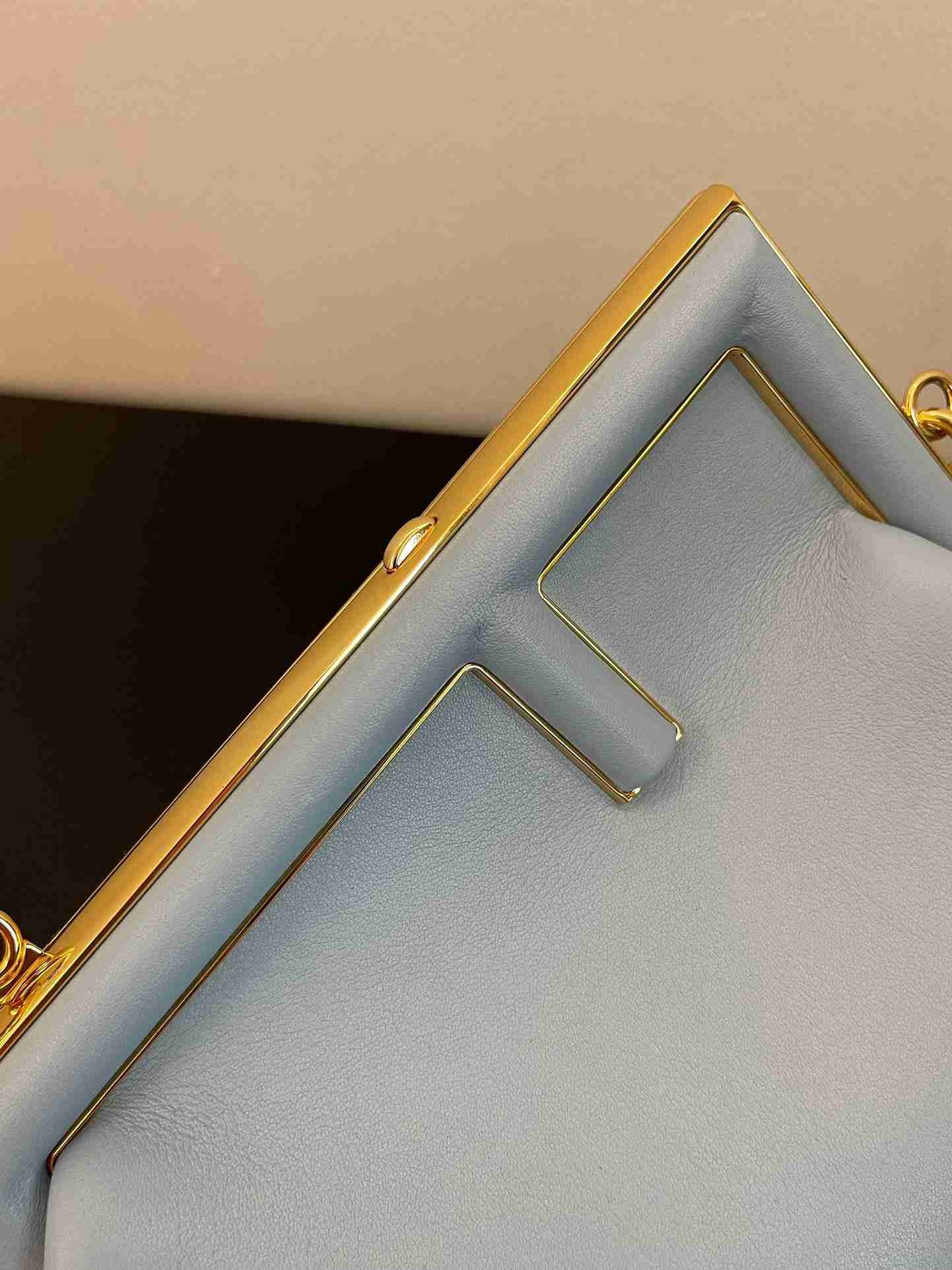 正品级 原厂皮版本 小号蓝色全新FEND1 First来了!!设计师Kim Jones主导下,设计的第一款Fend1,颠覆了以往的包型,金属包边大Logo锁扣加上包身设计把建筑艺术的解构与时装相结合,优雅中带着酷飒,一秒吸睛!手拿出席晚宴气场十足,斜挎也有种高级街头chic感!小号尺寸26×9.5x18cm