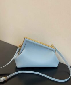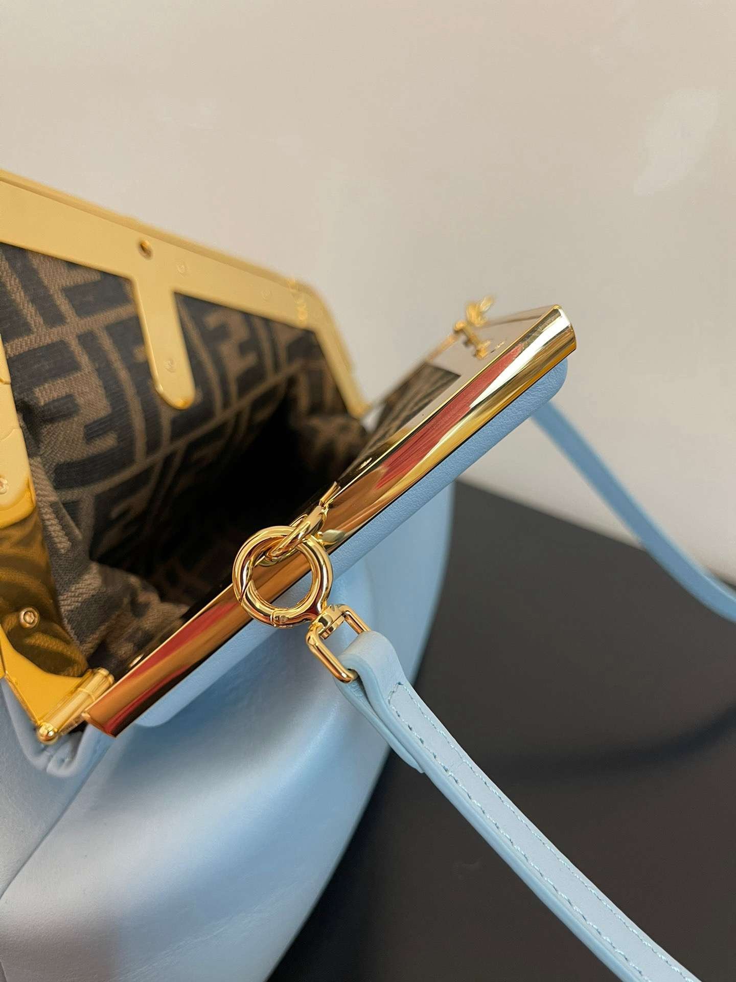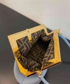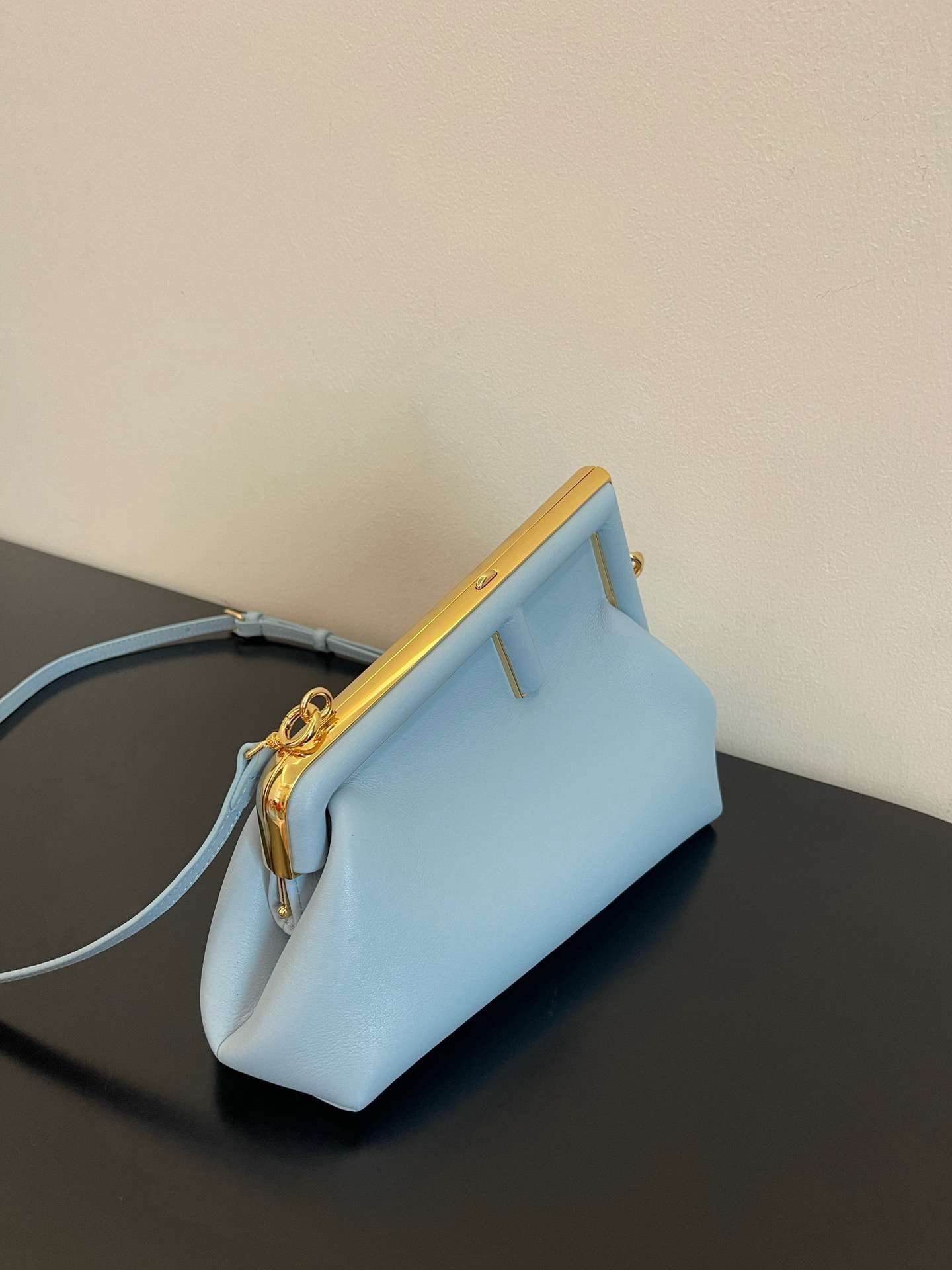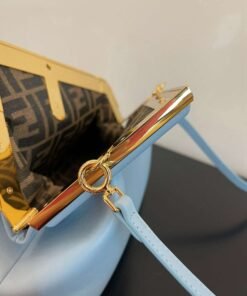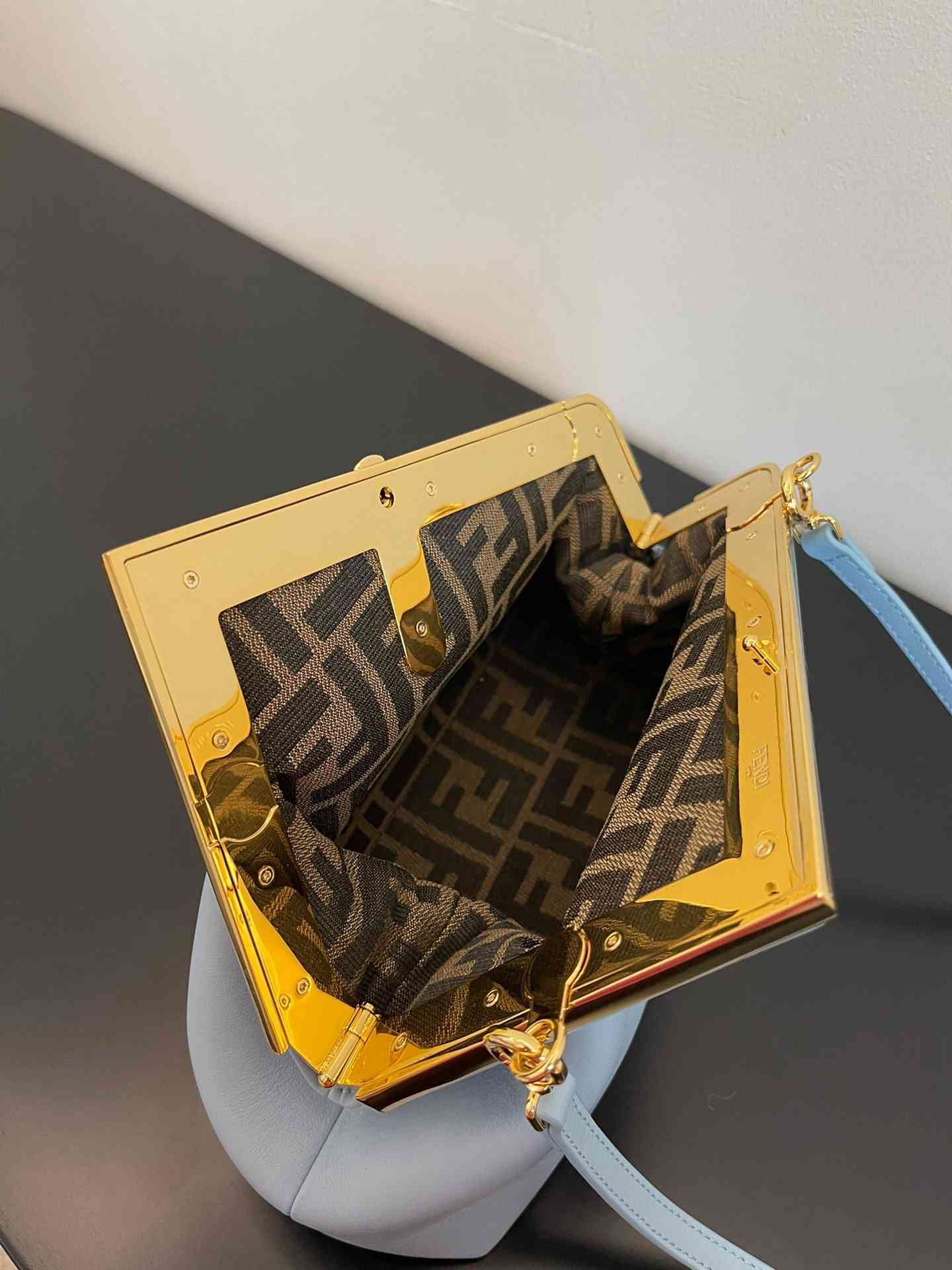 正品级 原厂皮版本 小号蓝色全新FEND1 First来了!!设计师Kim Jones主导下,设计的第一款Fend1,颠覆了以往的包型,金属包边大Logo锁扣加上包身设计把建筑艺术的解构与时装相结合,优雅中带着酷飒,一秒吸睛!手拿出席晚宴气场十足,斜挎也有种高级街头chic感!小号尺寸26×9.5x18cm