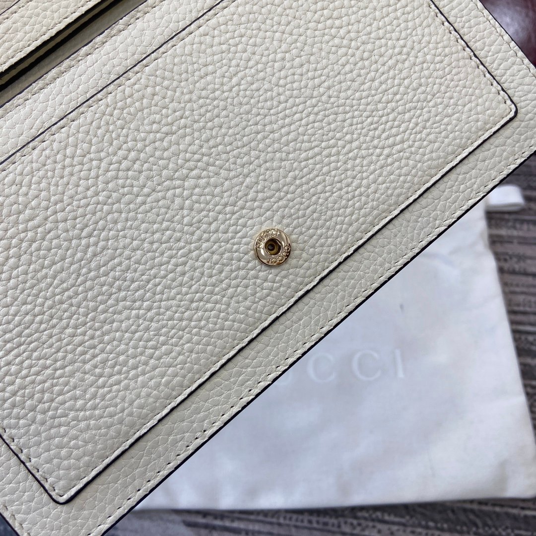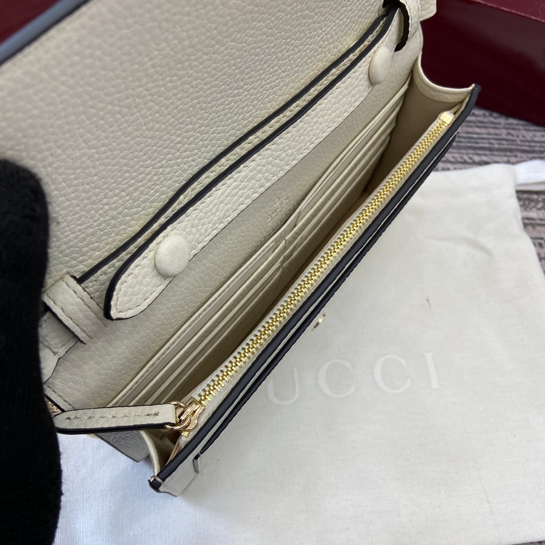 This Dionysus series leather strap wallet is crafted with white grain leather, skillfully incorporating a double button tiger head lock mechanism. The compact and elegant design makes it suitable for both day and night, accompanied by an adjustable chain shoulder strap.