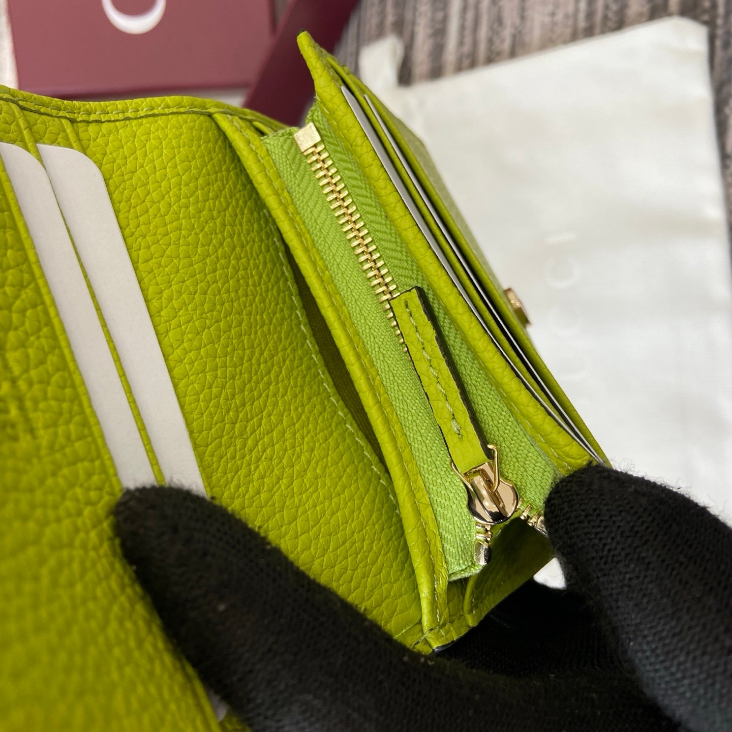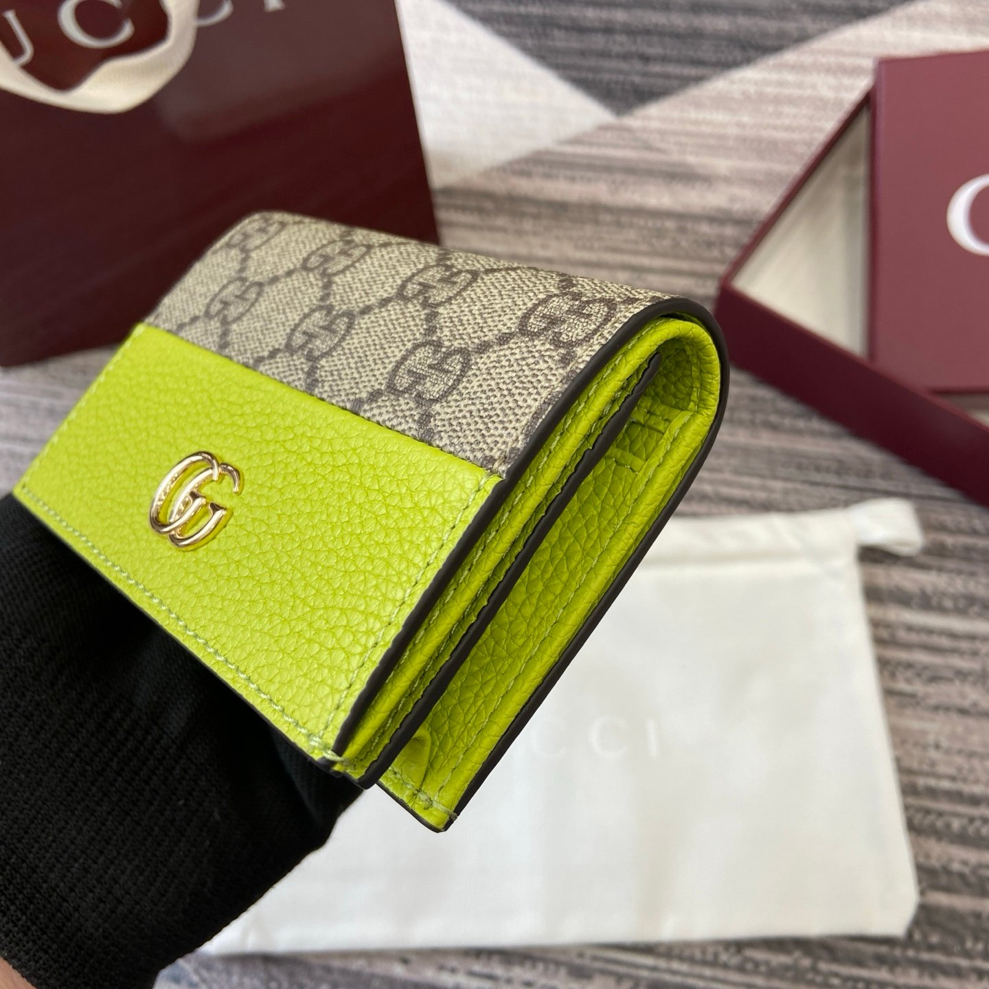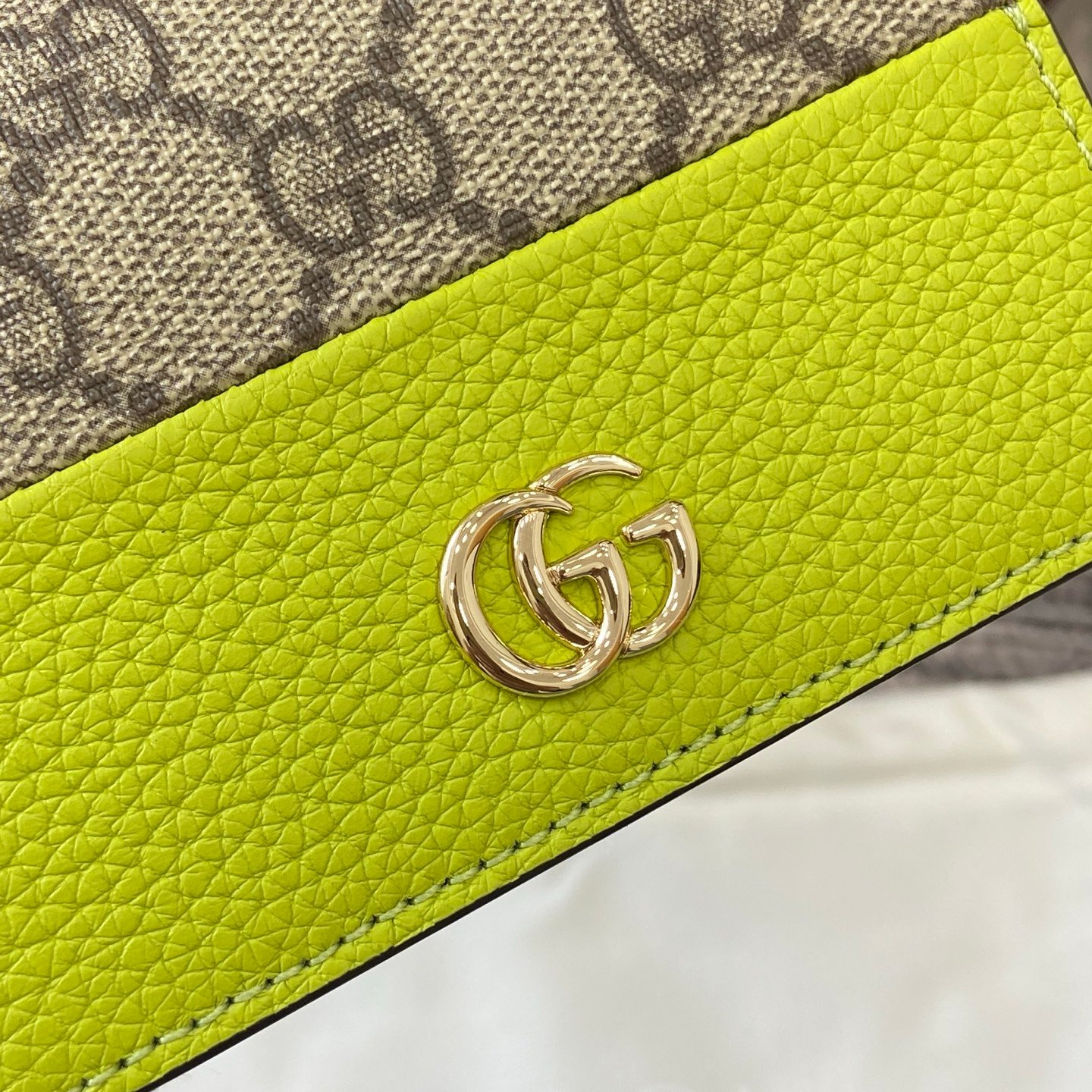 Original design from the 70s, the double G accessory continues to shine in the GG Marmont series. This wallet is made of brown and light green GG Supreme canvas with leather details in light green.