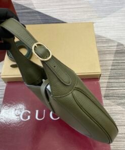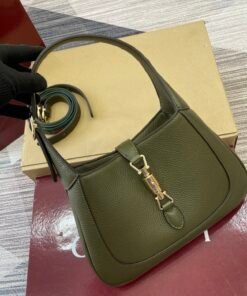 Gucci Jackie 1961 series shoulder bag, crafted with high-quality leather, features a shallow gold tone push-button lock and showcases the brand’s classic shoulder bag craftsmanship, crescent shape, and streamlined silhouette. This medium-sized handbag comes with one leather strap and one complimentary woven strap, offering multiple carrying options.
