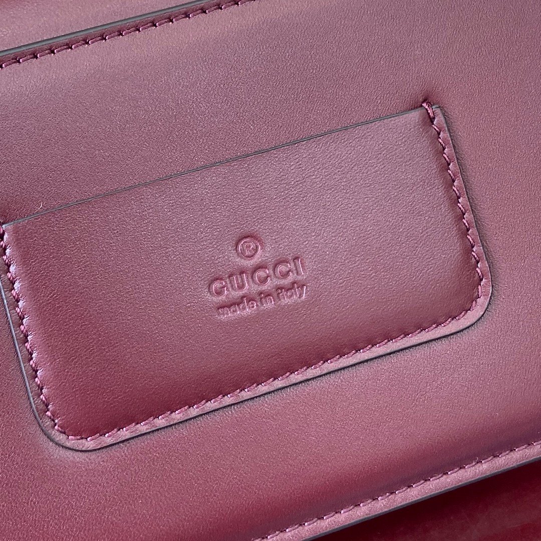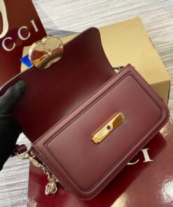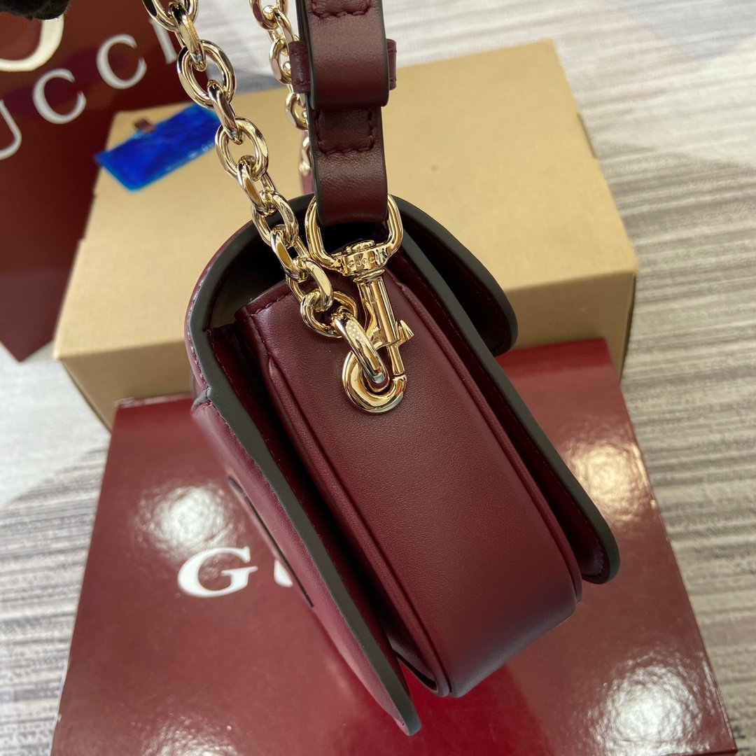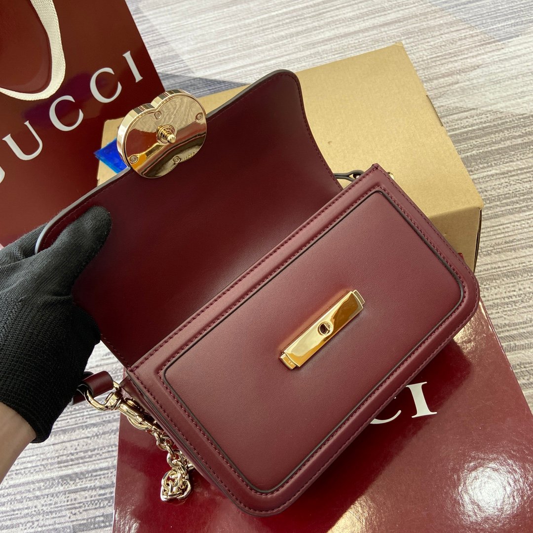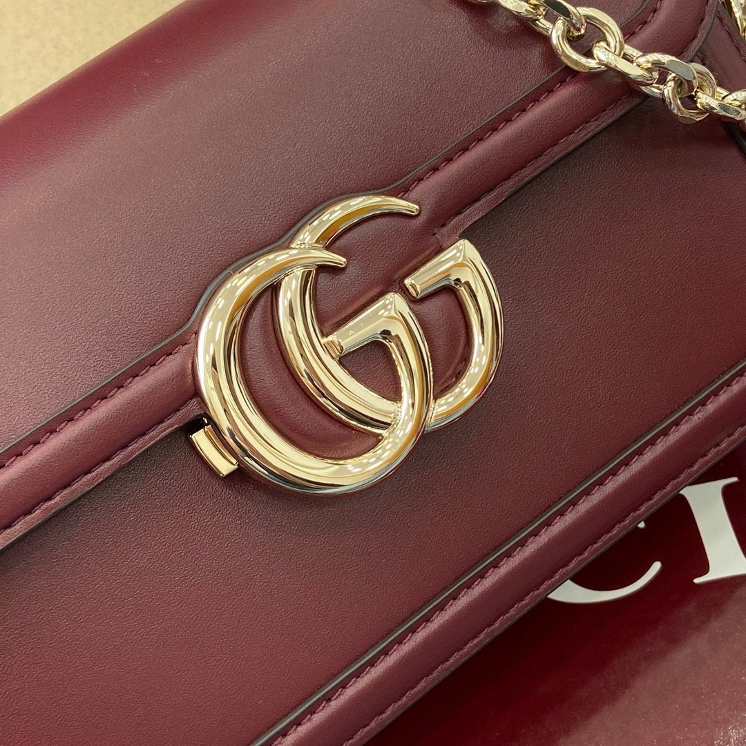 Gucci Go series is designed for sports. This shoulder bag is made of glossy leather and features a chain strap that exudes modern elegance. The interior layout is practical, with a detachable mirror on the backside.