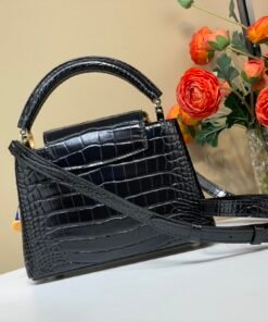 High-end alligator skin texture, luxurious lambskin lining, shiny metal accessories, the unique Capucines lid can be folded to show the letter logo or flipped out to display the Monogram Flower pattern.