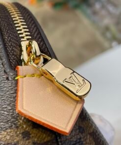 Pure copper hardware! Quality stock, this compact makeup bag is made of Monogram canvas and can easily fit into a handbag. The round body with flat bottom design makes it convenient to place cosmetics.