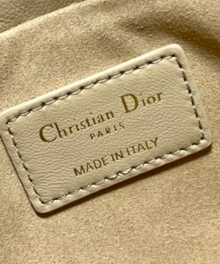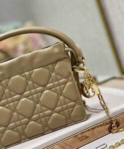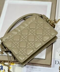 LADY DIOR 迷你手袋「杏色」高雅的复古风格迷你手袋是本季新品,搭配顶部手柄和抽绳设计,令 Lady Dior 系列更加丰富。采用金属灰色藤格纹羊皮革精心制作,饰以D.I.O.R.吊饰和抽绳开合。搭配可拆卸的皮革手柄,可拆卸链条点缀以珠饰,可手拿或斜挎。p正面D.I.O.R.吊饰抽绳设计顶部可拆卸皮革手柄可拆卸的链条点缀以珠饰型号:0981尺寸:19 x 13 x 5 可收纳各种 iPhone 尺寸的物品